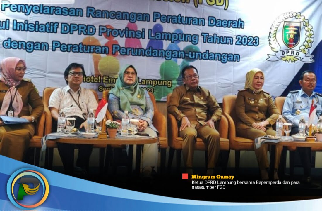 psiaceh.or.id/ – Ketua DPRD Provinsi Lampung Bapak Mingrum Gumay, SH., MH. membuka Acara Focus Group Discussion  (FGD) dalam rangka penyelarasan Rancangan Peraturan Daerah Usul Inisiatif DPRD Provinsi Lampung tahun 2023 dengan Peraturan Perundang – Undangan, Senin (29/05/2023).